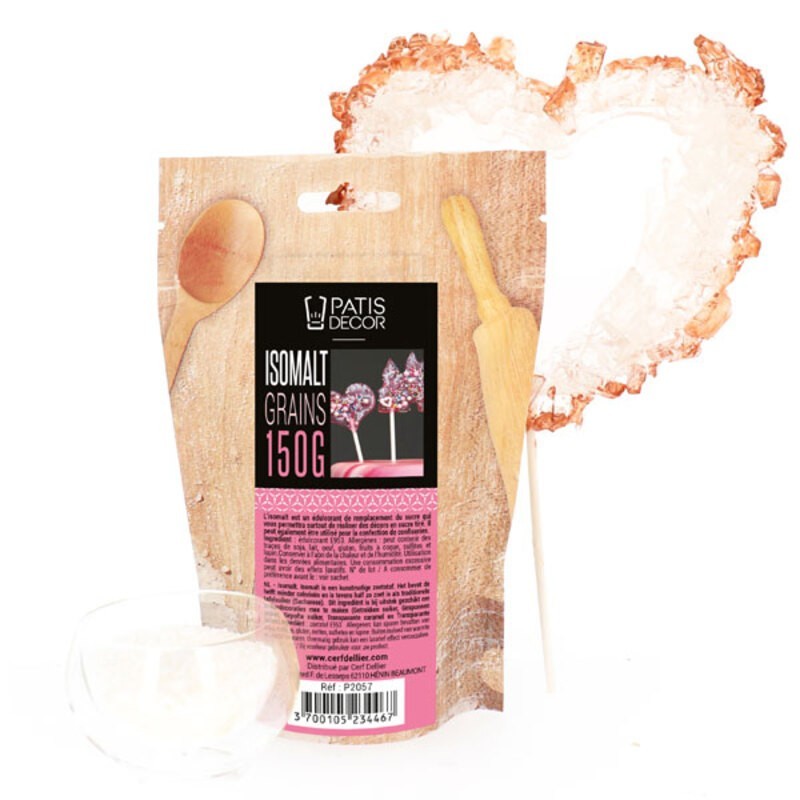 L'isomalt est un sucre décor déjà cuit utilisé en cake design par les décorateurs de gâteaux pour créer des diamants, des pierres précieuses ou du verre comestibles : il se colore avec du colorant alimentaire en poudre et peut s'aromatiser