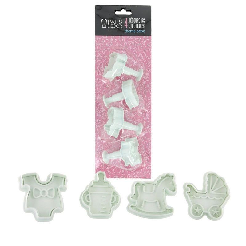 Jeu de 4 découpoirs éjecteurs thème bébé parfaits pour la réalisation de décors en pâte à sucre et pâte d'amandes.